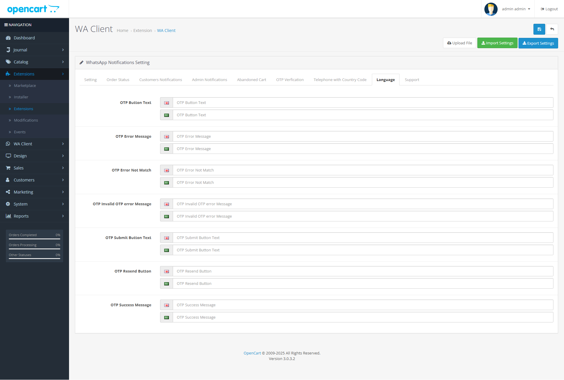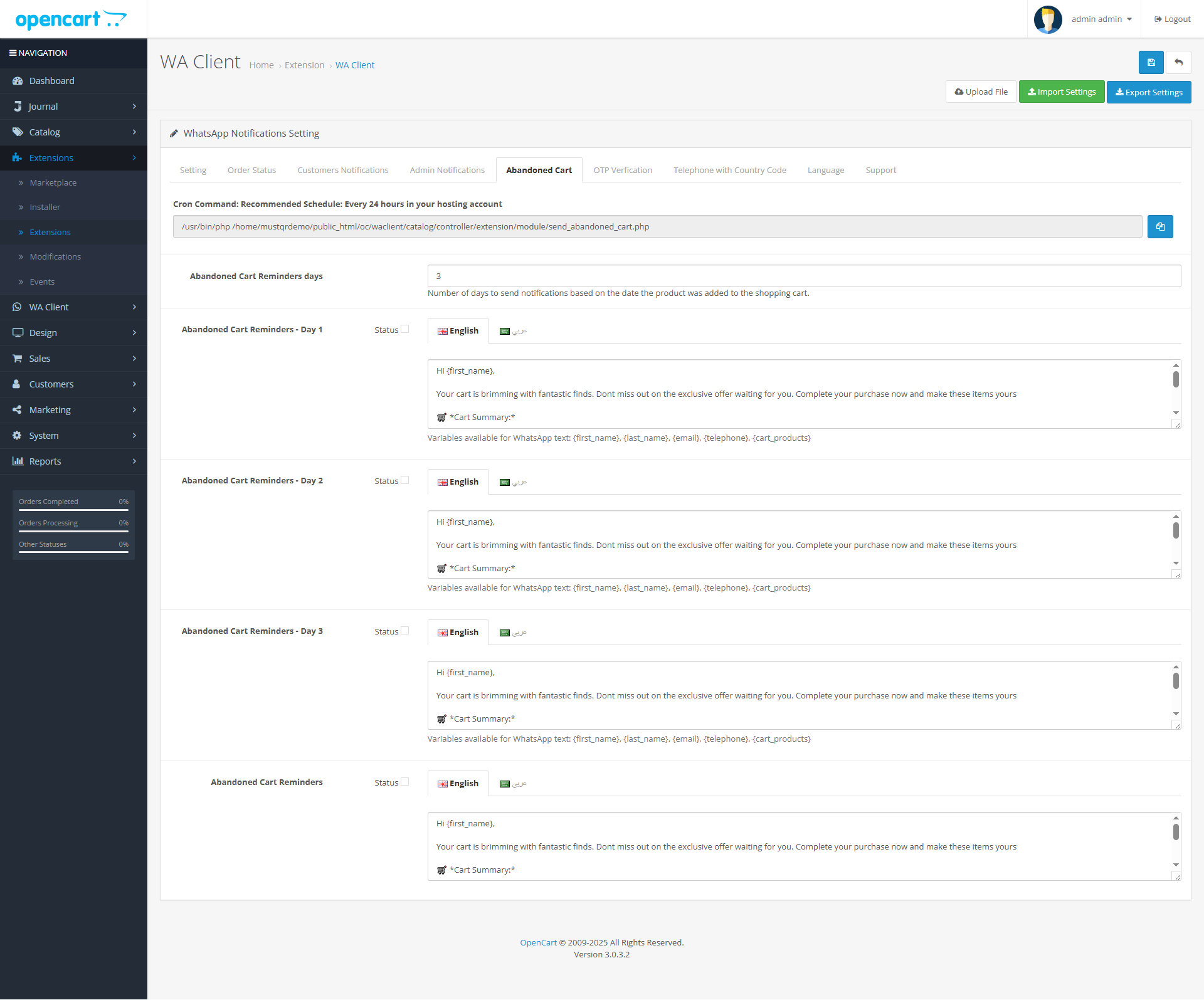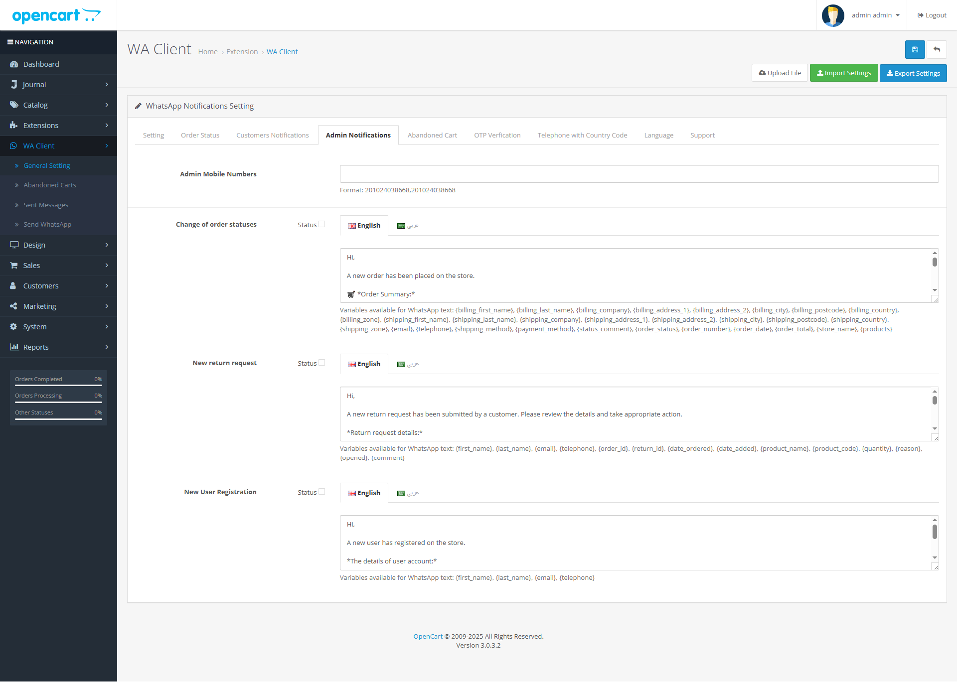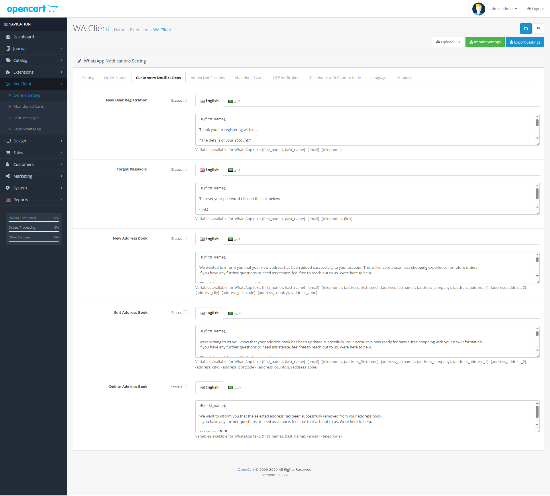 New Feature Added abandoned cart reminders template.New Feature Added new user registration template.New Feature Added edit address book template.New Feature Added delete address book template.New Feature Added change of order status template for admin.New Feature Added new user registration template for admin.New Feature Added emoji support.New Feature Added option to set delay time between each message.New Feature Added default country code setting.New Feature Added country selection for phone numbers on registration and profile pages.
