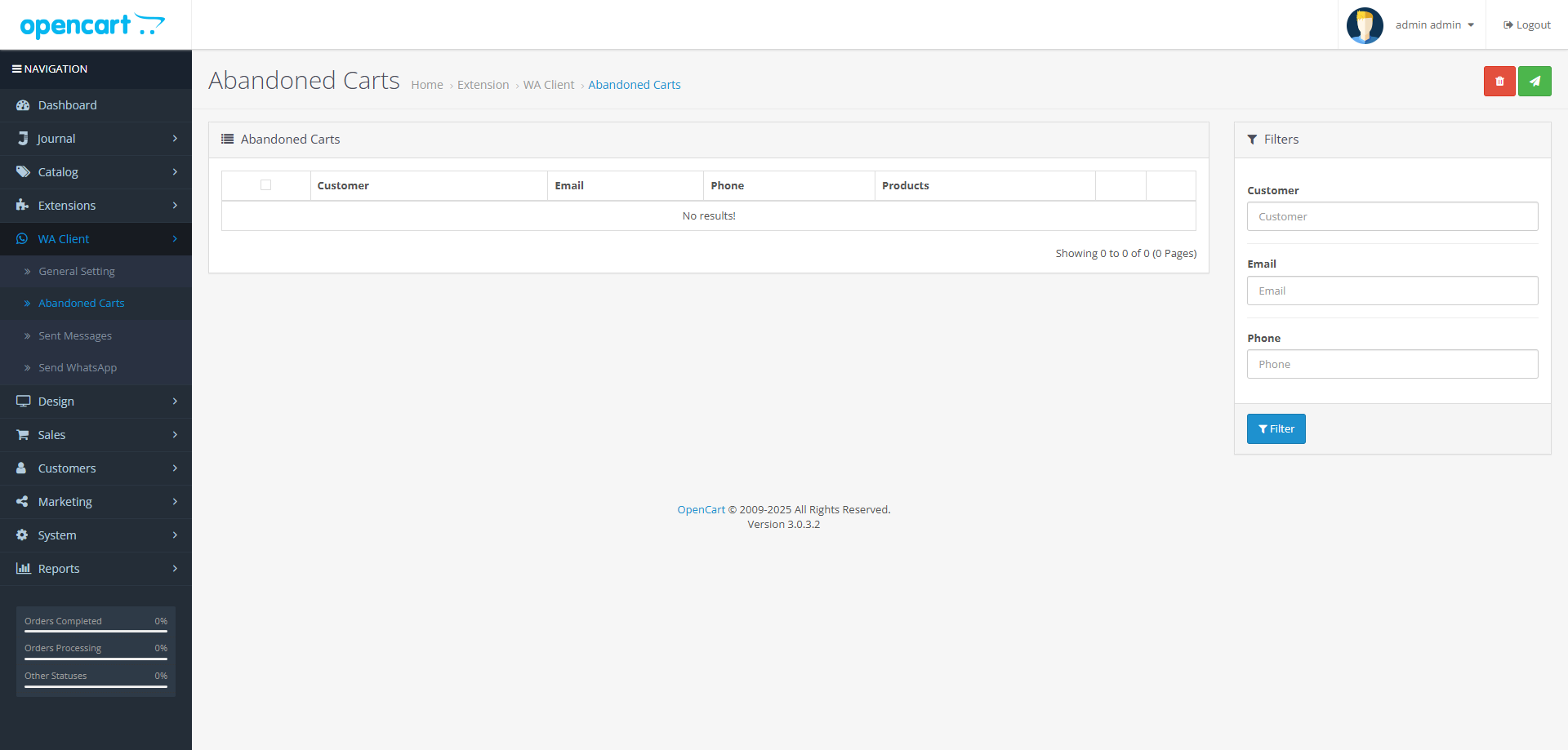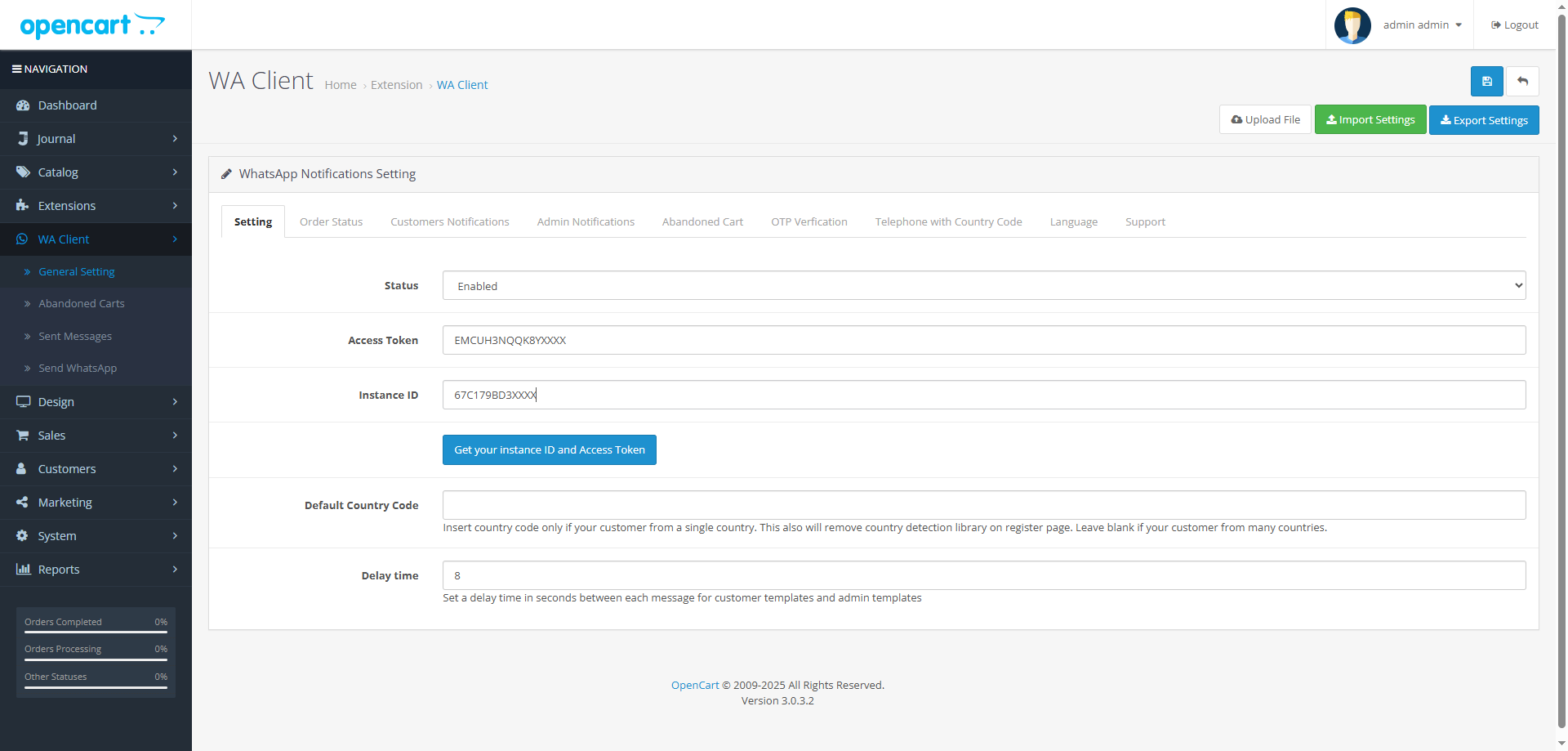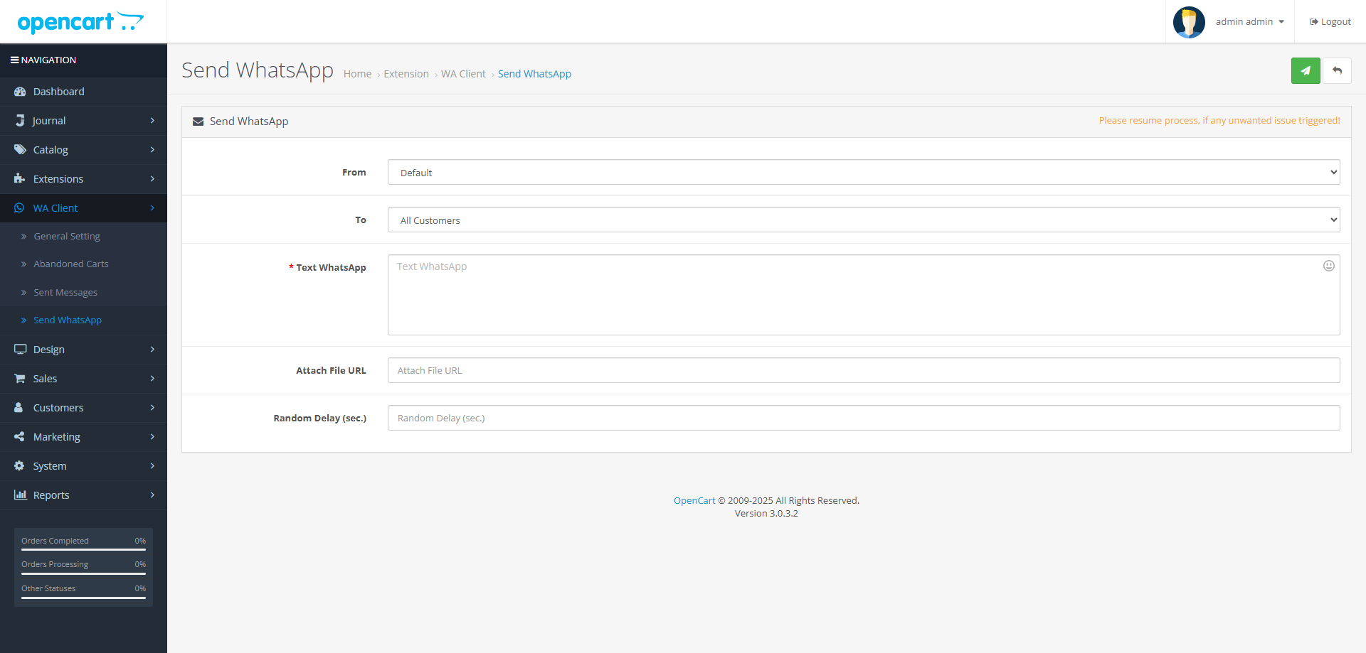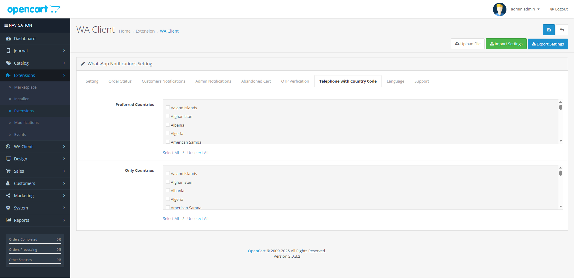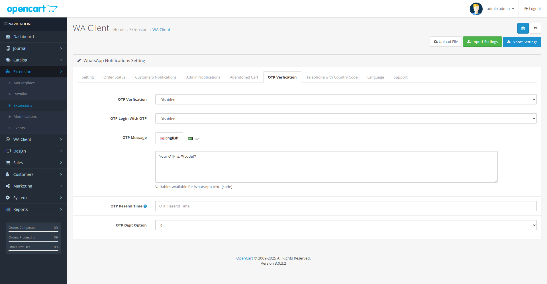 New Feature Added abandoned cart reminders template.New Feature Added new user registration template.New Feature Added edit address book template.New Feature Added delete address book template.New Feature Added change of order status template for admin.New Feature Added new user registration template for admin.New Feature Added emoji support.New Feature Added option to set delay time between each message.New Feature Added default country code setting.New Feature Added country selection for phone numbers on registration and profile pages.