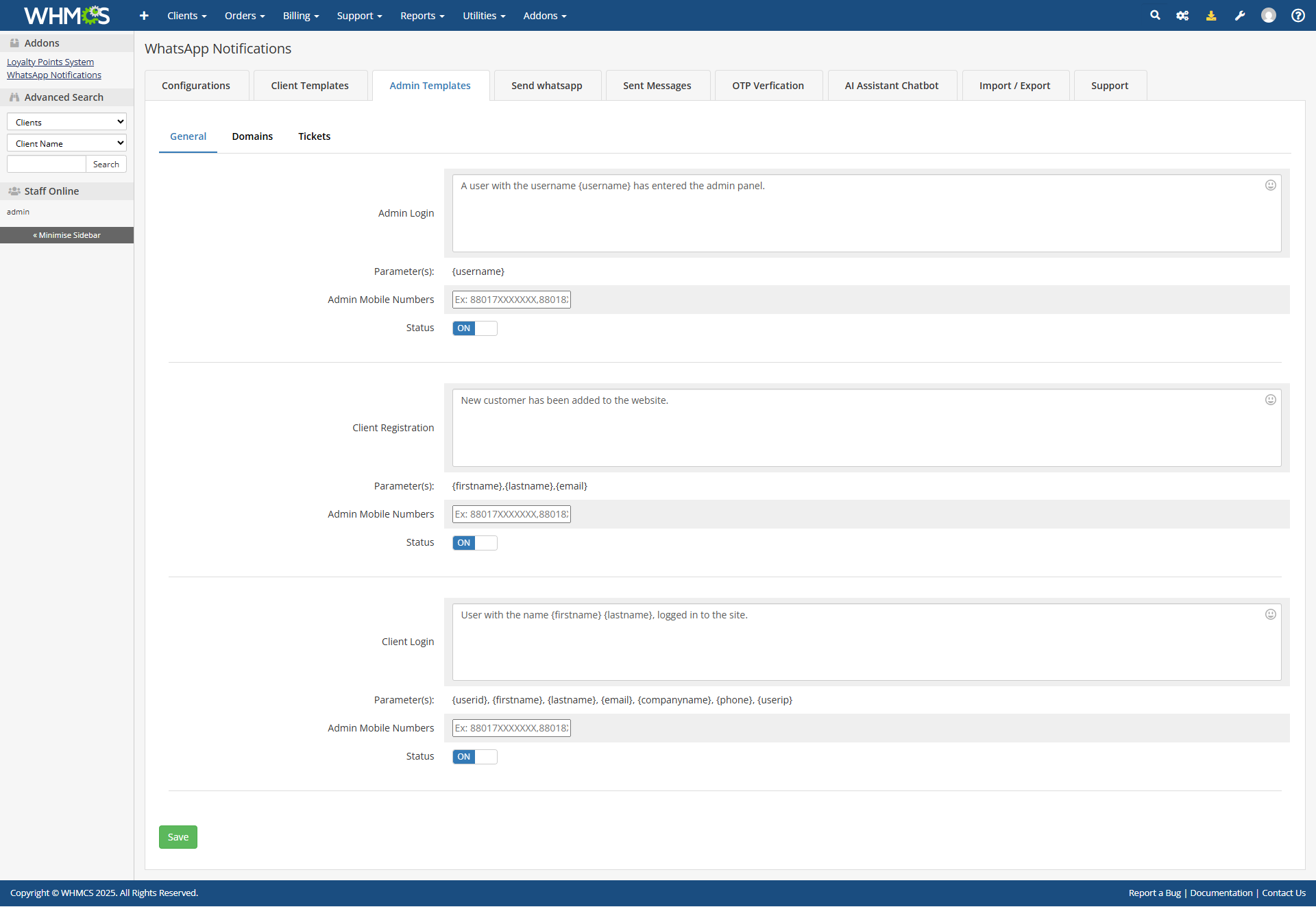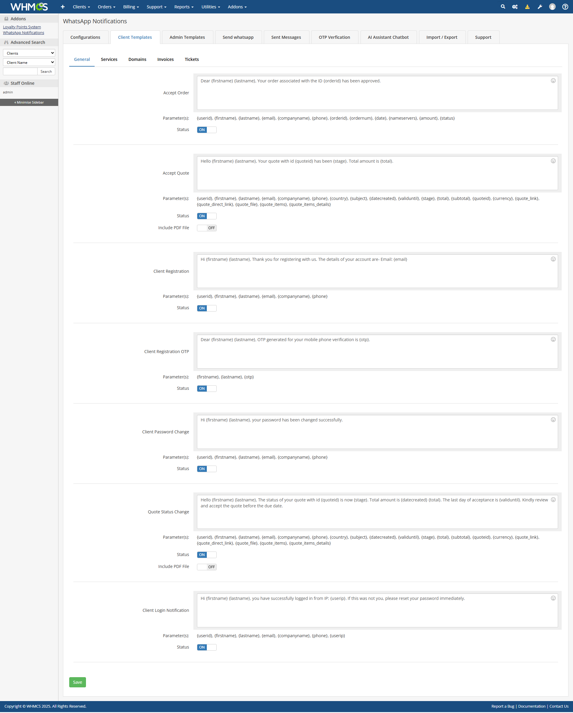 Tailor every WhatsApp message to match your brand. Easily customize the content, language, and structure of notification templates for various WHMCS events right from the admin panel.