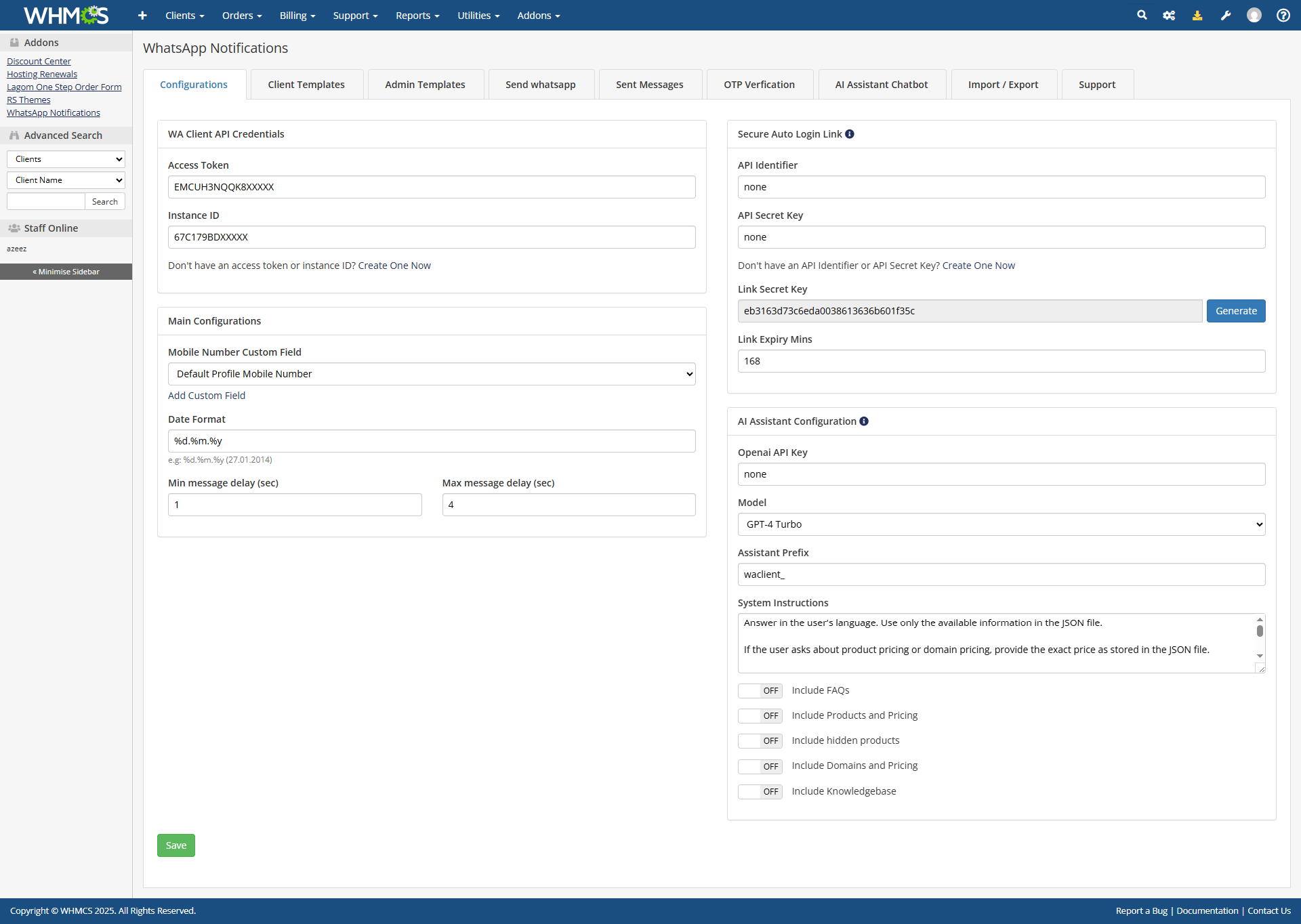 Automatically answer client WhatsApp messages using AI powered by your WHMCS Knowledgebase, product data, domain pricing, and FAQs reducing manual support workload.