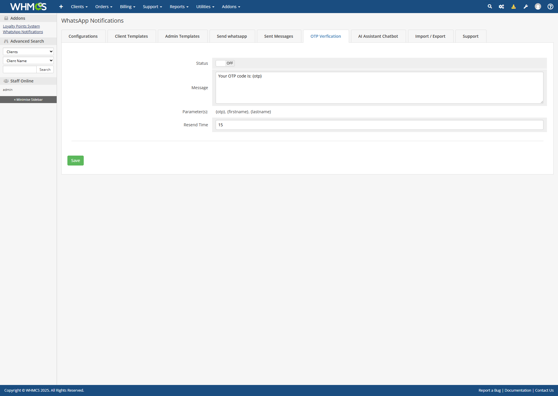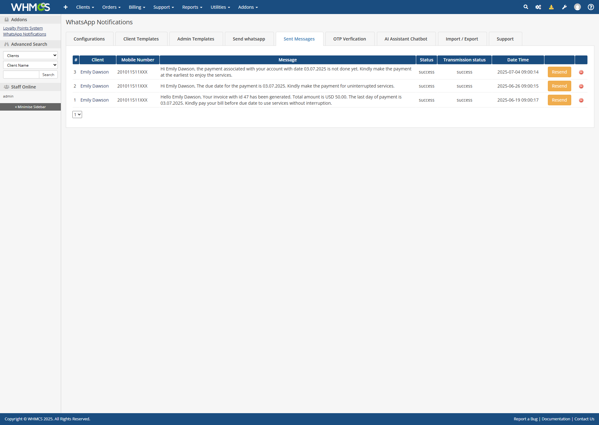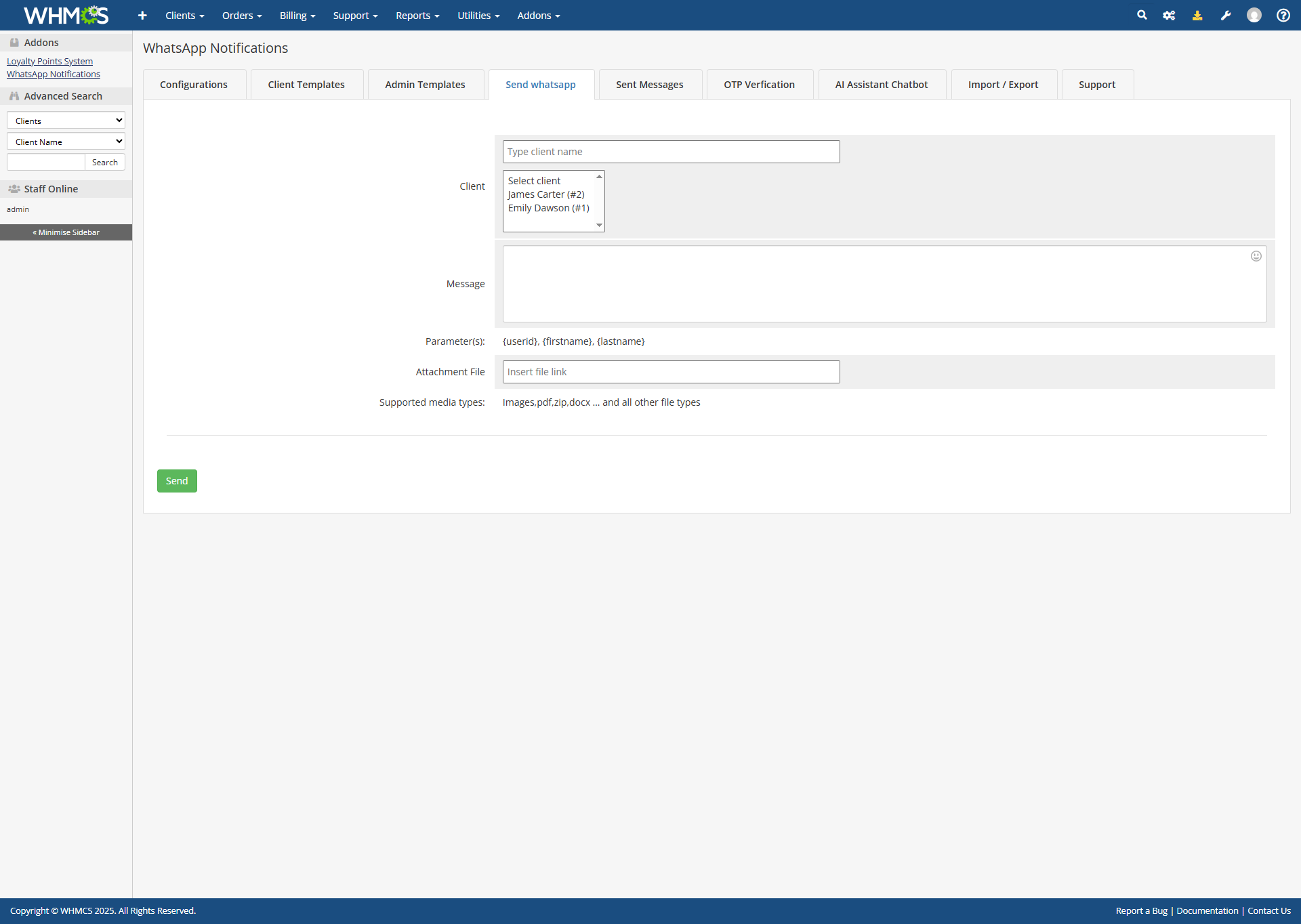 Improvement General module improvements.New Feature Added Client ID variable.New Feature Added support for sending media messages.New Feature Added message box in client summary to send messages directly.New Feature Added manual invoice reminder button.