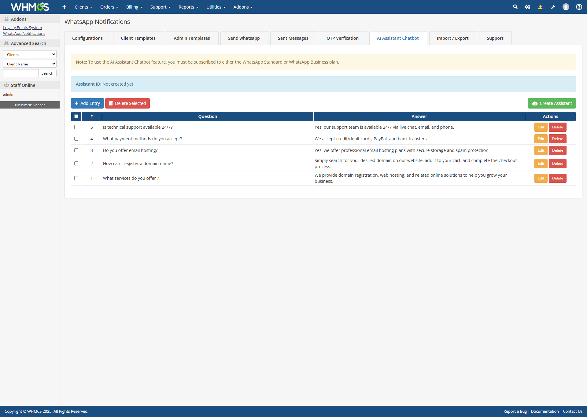 New Feature Added OTP verification system.New Feature Introduced AI Assistant Chatbot – auto-responds to WhatsApp messages using your Knowledgebase, Products, FAQs, and Domain Pricing.New Feature Added Min/Max message delay settings for WhatsApp message intervals.Bug Fix General bug fixes and performance enhancements.