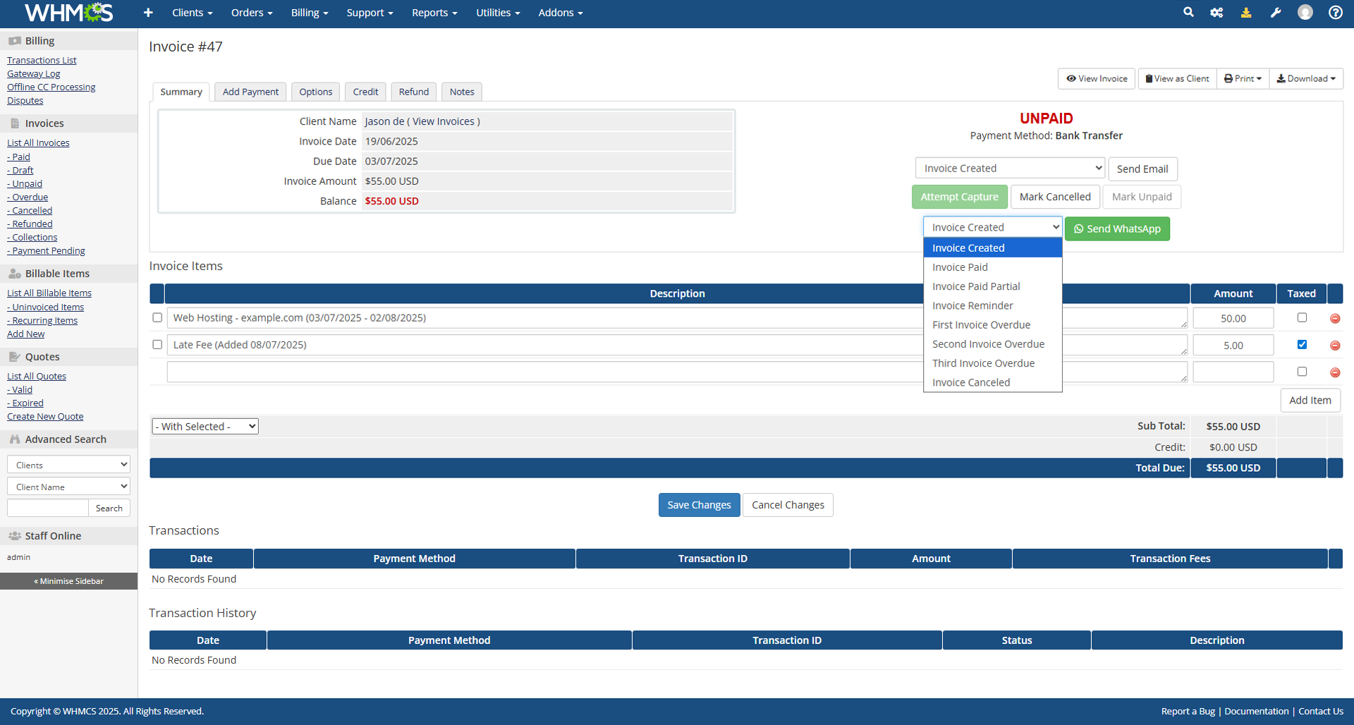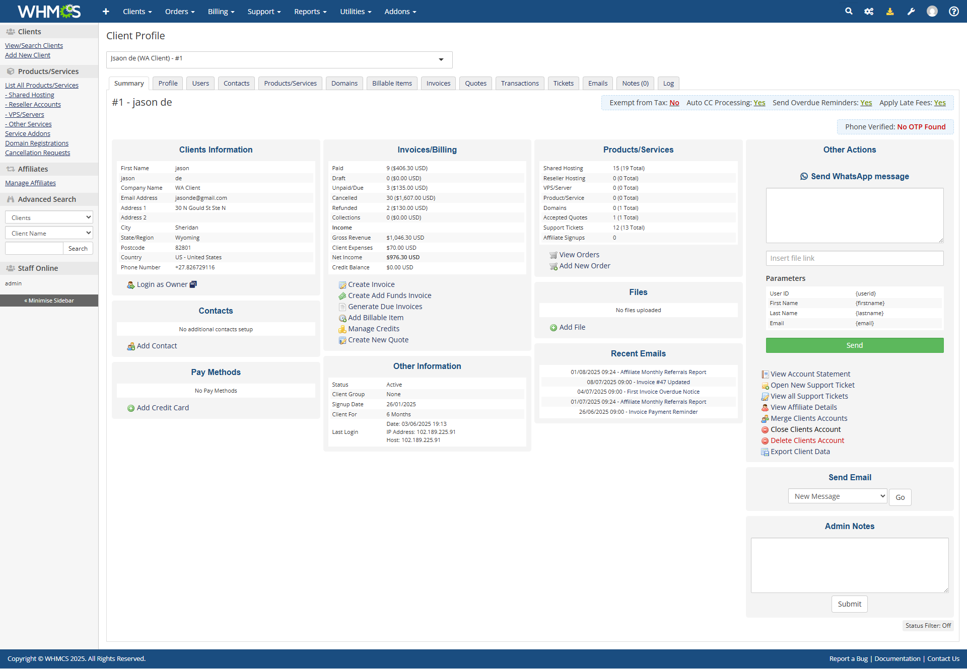 Manually send personalized messages or invoice-related notifications directly from a client’s profile in WHMCS perfect for urgent updates or special cases.